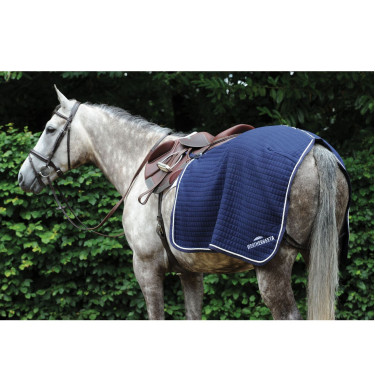 O corte de competição contornado adapta-se perfeitamente ao redor da sela, fixando-se com uma aba de velcro segura, permitindo montar com facilidade e segurança. A bainha curvada cobre eficazmente as costas e os quartos do cavalo, oferecendo proteção adicional durante o exercício em dias frios ou chuvosos.